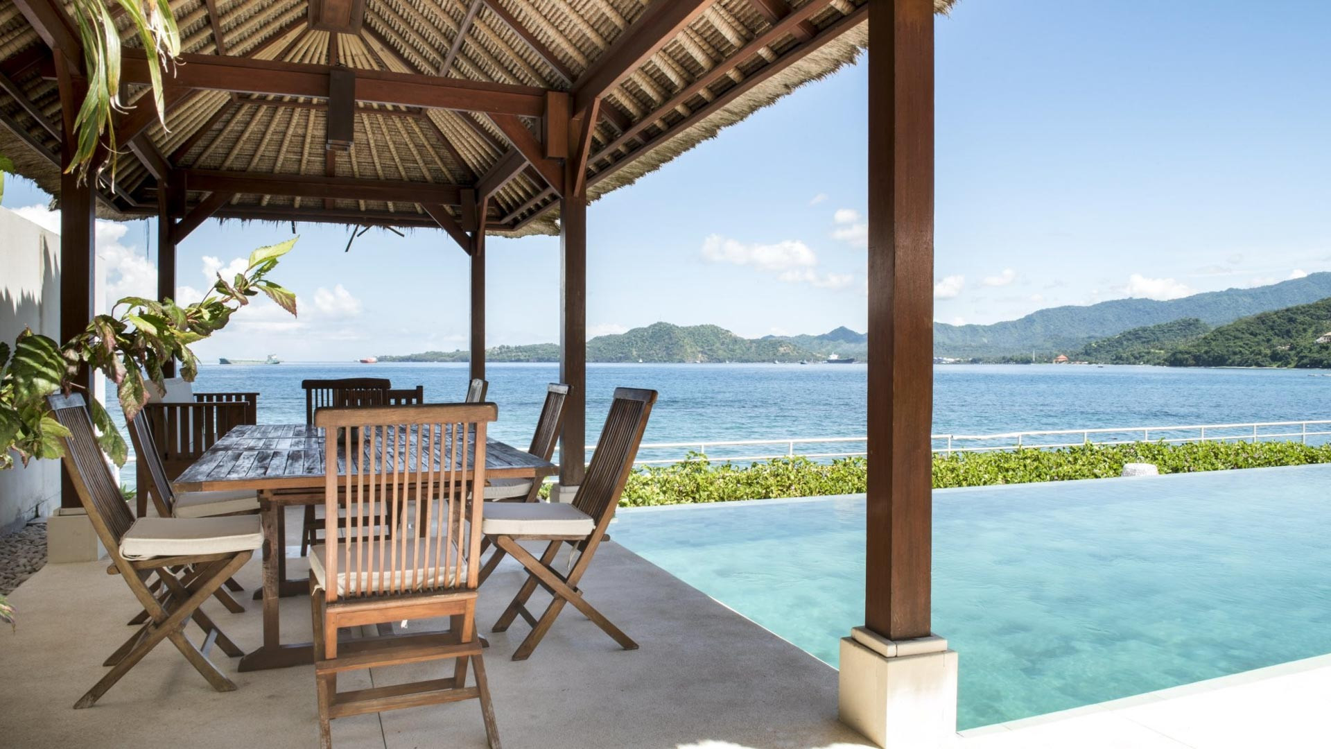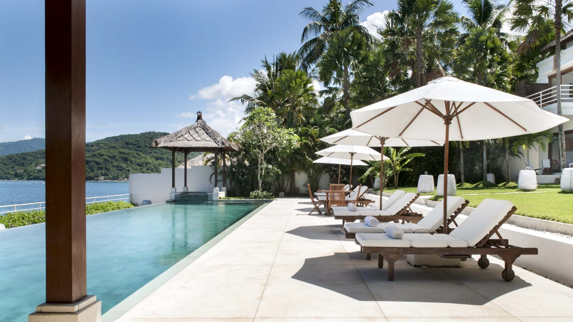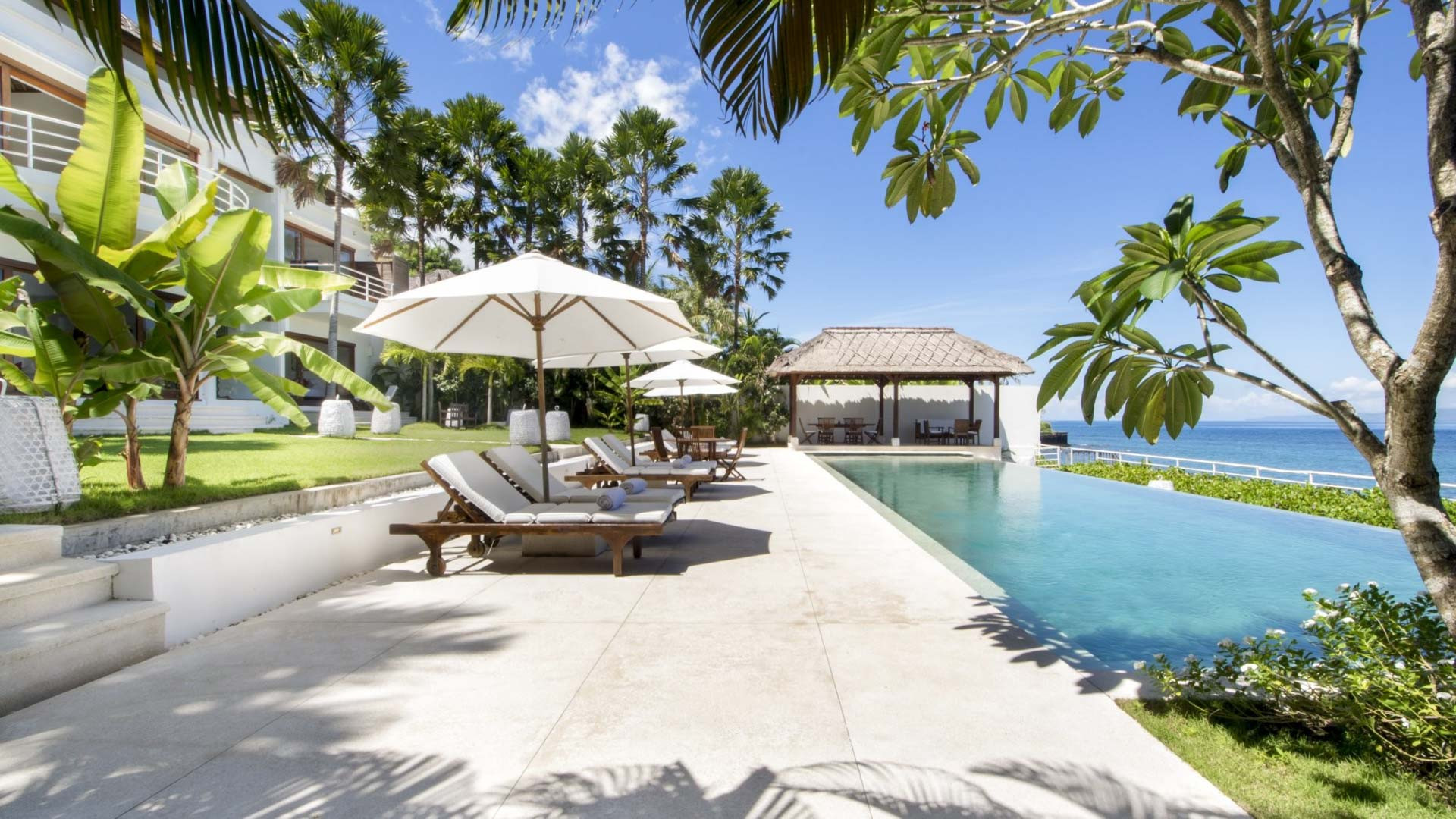 Vila ini memiliki kolam renang sepanjang 20 meter yang menawarkan pemandangan panorama teluk. Kolam renang diapit oleh kursi berjemur dan payung. Di salah satu ujung kolam, ada bale beratap jerami dan di ujung lainnya, area makan outdoor yang teduh.