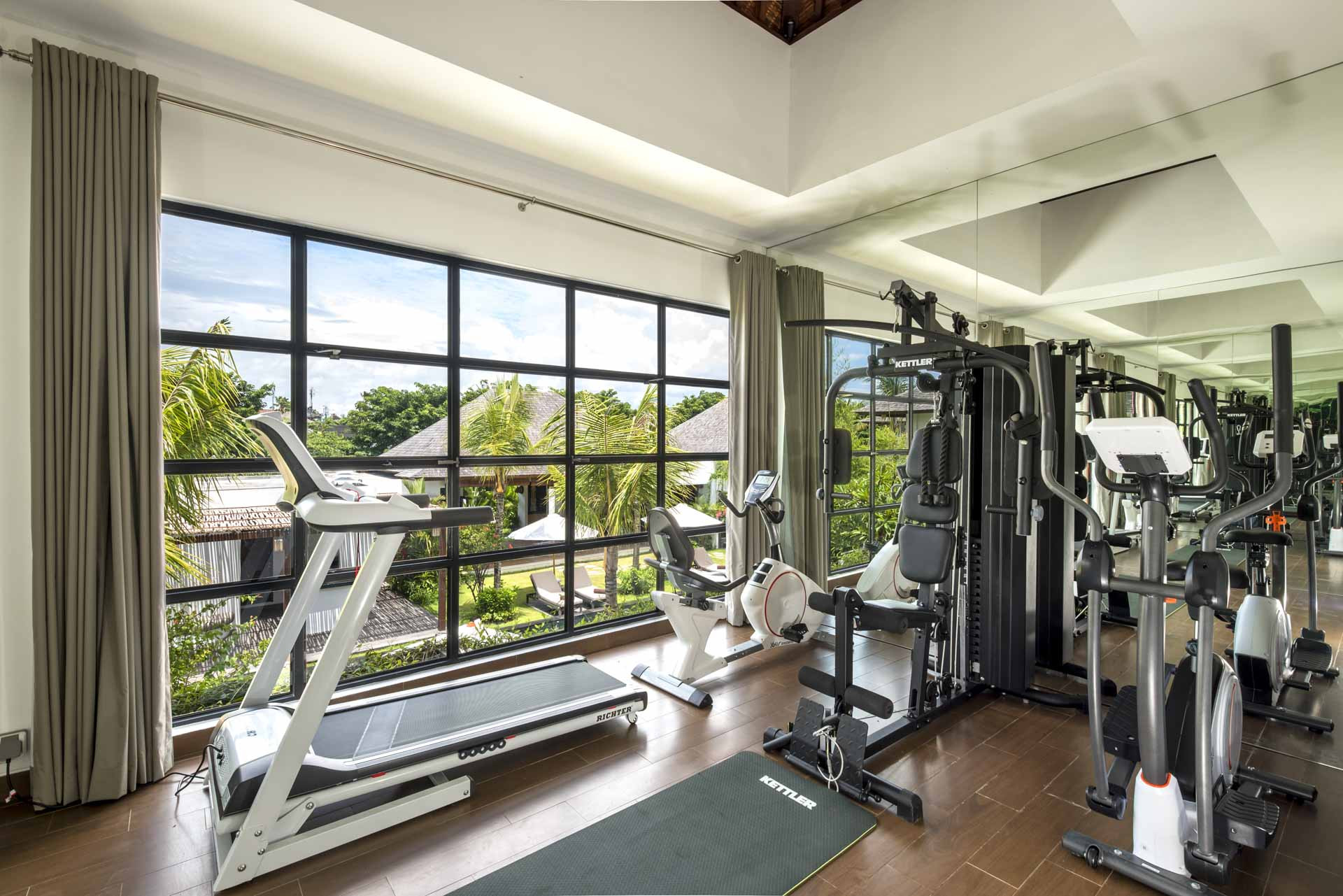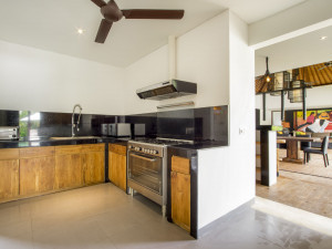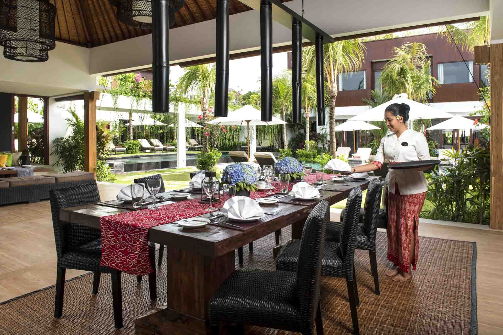 Di sisi lain ruangan, ada ruang makan yang dilengkapi dengan baik dengan meja makan delapan tempat duduk yang diletakkan di atas permadani oriental. Ada pahatan batu Bali yang menghiasi dinding ruangan, disorot oleh lampu di atas kepala. Di belakang meja makan, Anda akan menemukan bar bergaya barat.Membentuk T-shape, dua kolam renang di Denting Villa dipisahkan oleh gapura putih yang memiliki vegetasi berlimpah yang tumbuh di atas menciptakan pemandangan magis bagi para tamu yang berenang di kolam. Dikelilingi oleh tanaman hijau subur di semua sisi, kolam renang adalah tempat yang ideal untuk menghabiskan waktu di luar ruangan, karena Anda dapat berjemur di kursi santai atau tidur siang di gazebo yang dilengkapi dengan sofa daybed. Pemandangan yang menakjubkan dilengkapi dengan angin segar dan matahari tropis yang menyinari air kolam yang sejuk. Halaman rumput yang terawat baik adalah tempat Anda bisa berjalan di atas rumput yang baru dipotong dan bermain dengan anak-anak. Setelah berenang yang menyegarkan, Anda dapat menikmati layanan BBQ pribadi yang disiapkan oleh koki atau minuman dingin dari area rekreasi tepi kolam renang. Lounge di puncak gedung yang menawarkan pemandangan kolam renang yang indah dan tanaman hijau yang asri, dilengkapi dengan langkan yang empuk.