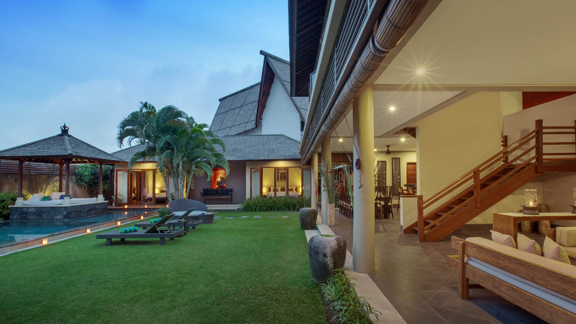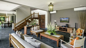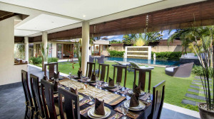 Sementara kedua vila menikmati ruang tamu dan ruang makan terbuka mereka sendiri yang menghadap ke setiap kolam renang, paviliun terbuka yang besar dari vila Mii Besar, dengan atap jerami yang menjulang tinggi, area bar dan kolam ikan hias, adalah pusat sosial utama dari perkebunan. Berkumpul di meja makan atau duduk di sofa yang nyaman sambil berkumpul bersama teman-teman sambil melihat anak-anak bermain atau bermain di taman tropis. Bar bahkan memiliki TV layar datar 75 inci built-in lengkap dengan Apple-TV, TV kabel dan TV satelit, sehingga Anda dapat menonton semua program favorit Anda.