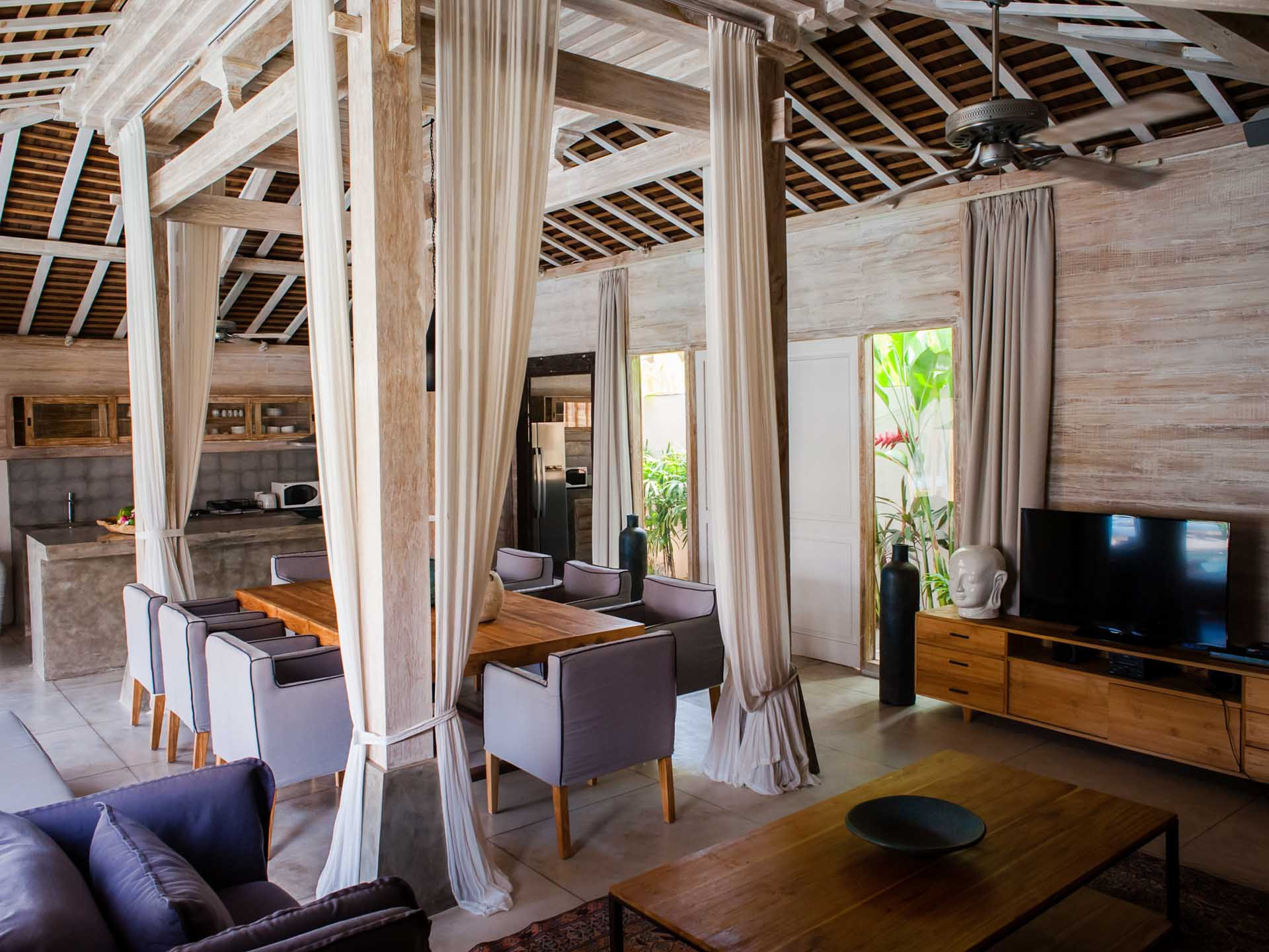 Ruang makan untuk delapan orang tempat Anda bisa menikmati makanan khas Bali yang otentik serta hidangan asing yang dibuat oleh koki residen di dapur bergaya modern. Berperalatan lengkap yang berada di ruang terpisah tepat di belakang ruang makan.