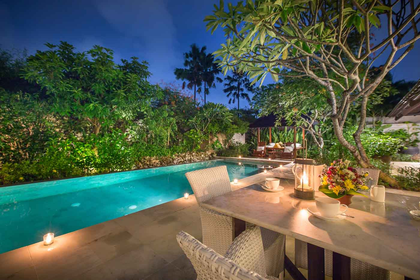 Yang membedakan dari vila lainnya adalah semua lampunya terletak rendah, semua celling bebas dari lampu untuk suasana yang lebih damai dan taman lanskap yang terawat indah dengan tema Jepang.