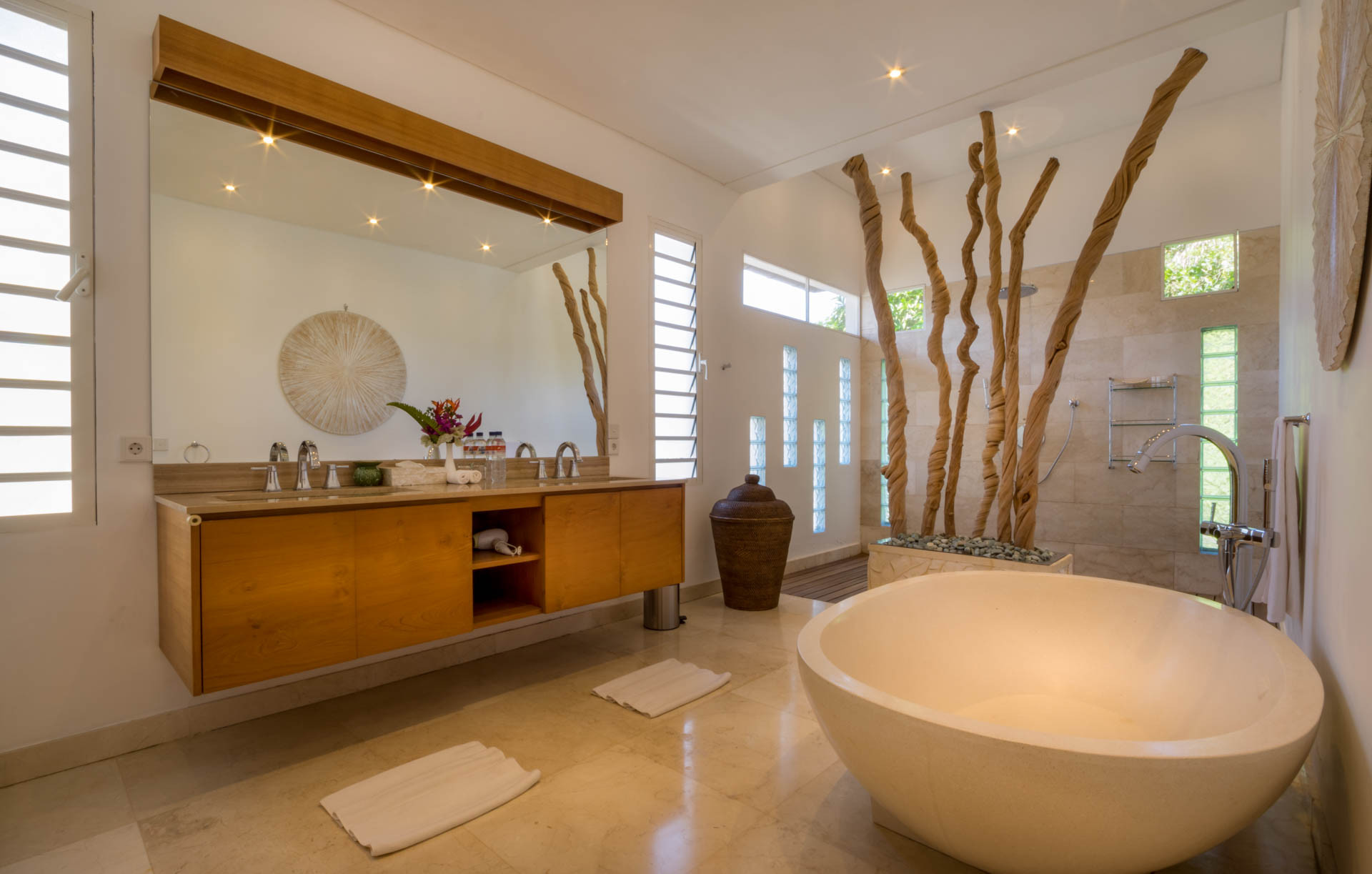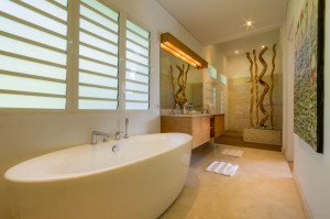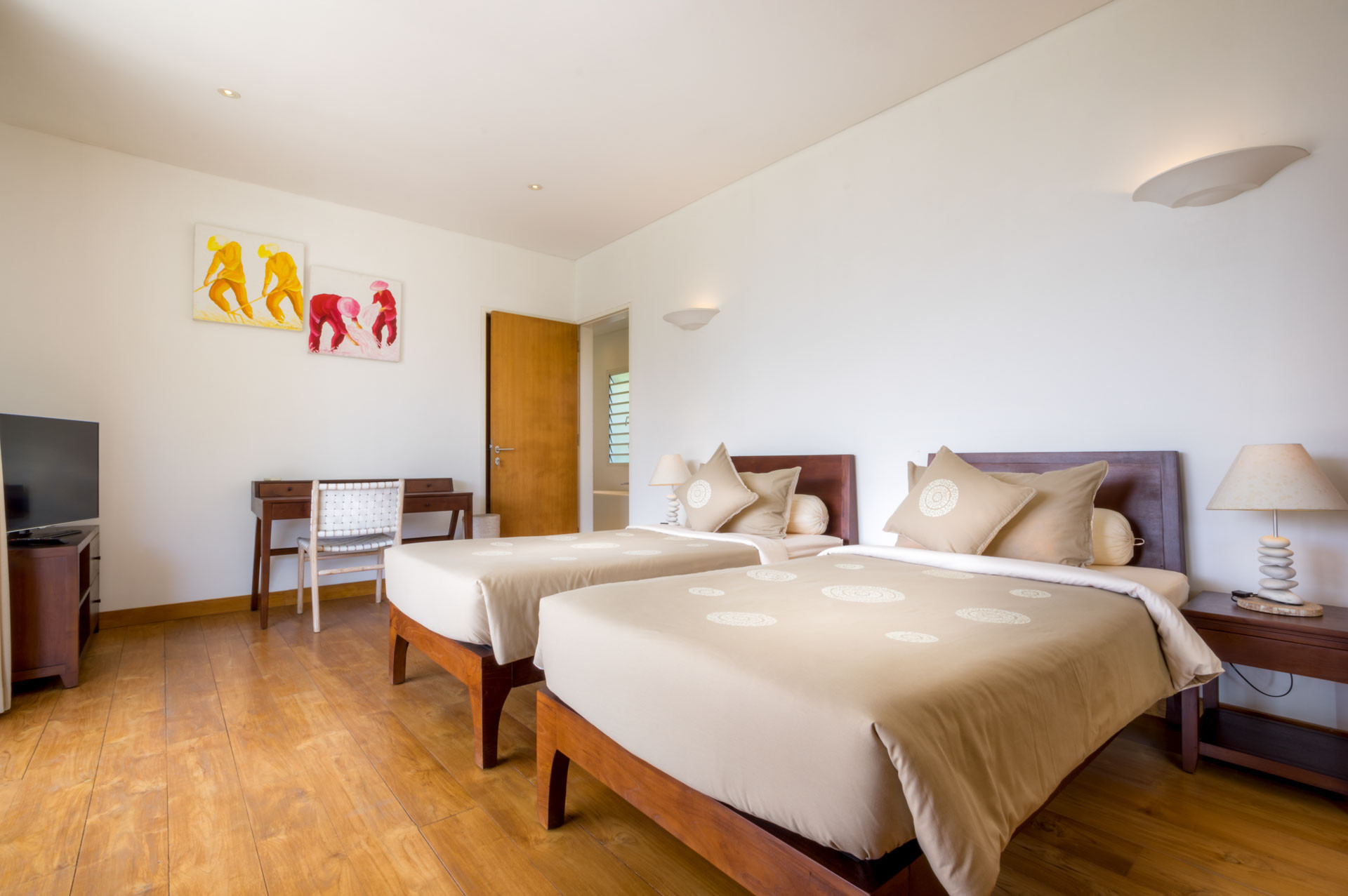 Kamar tidur kedua dan ketiga juga terhubung ke teras atas yang menampilkan sofa daybed besar yang didekorasi dengan bantal berwarna indah dan kain dari India. Satu kamar memiliki tempat tidur king dan tempat tidur twin lainnya, sementara kedua kamar memiliki lemari pakaian besar, layar datar besar. televisi dan kamar mandi en-suite yang luas dengan bak mandi berukir batu dan pancuran hujan besar. Salah satu kamar memiliki lemari penuh dengan semua yang Anda butuhkan saat bepergian dengan bayi termasuk tempat tidur bayi, kereta bayi, bak mandi, dan kursi mobil. Terdapat tempat tidur queen dengan bantal warna-warni dan night stand dengan ukiran lampu merah untuk menciptakan suasana romantis. Ada ruang ganti di sebelah kiri Anda dan kamar mandi en-suite menawarkan shower di bawah langit biru Bali sambil dikelilingi oleh tanaman hijau tropis dan batu alam.