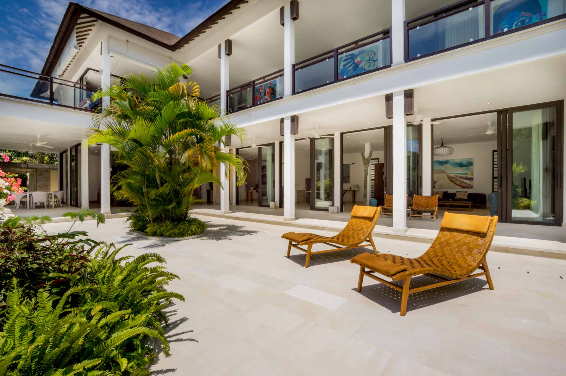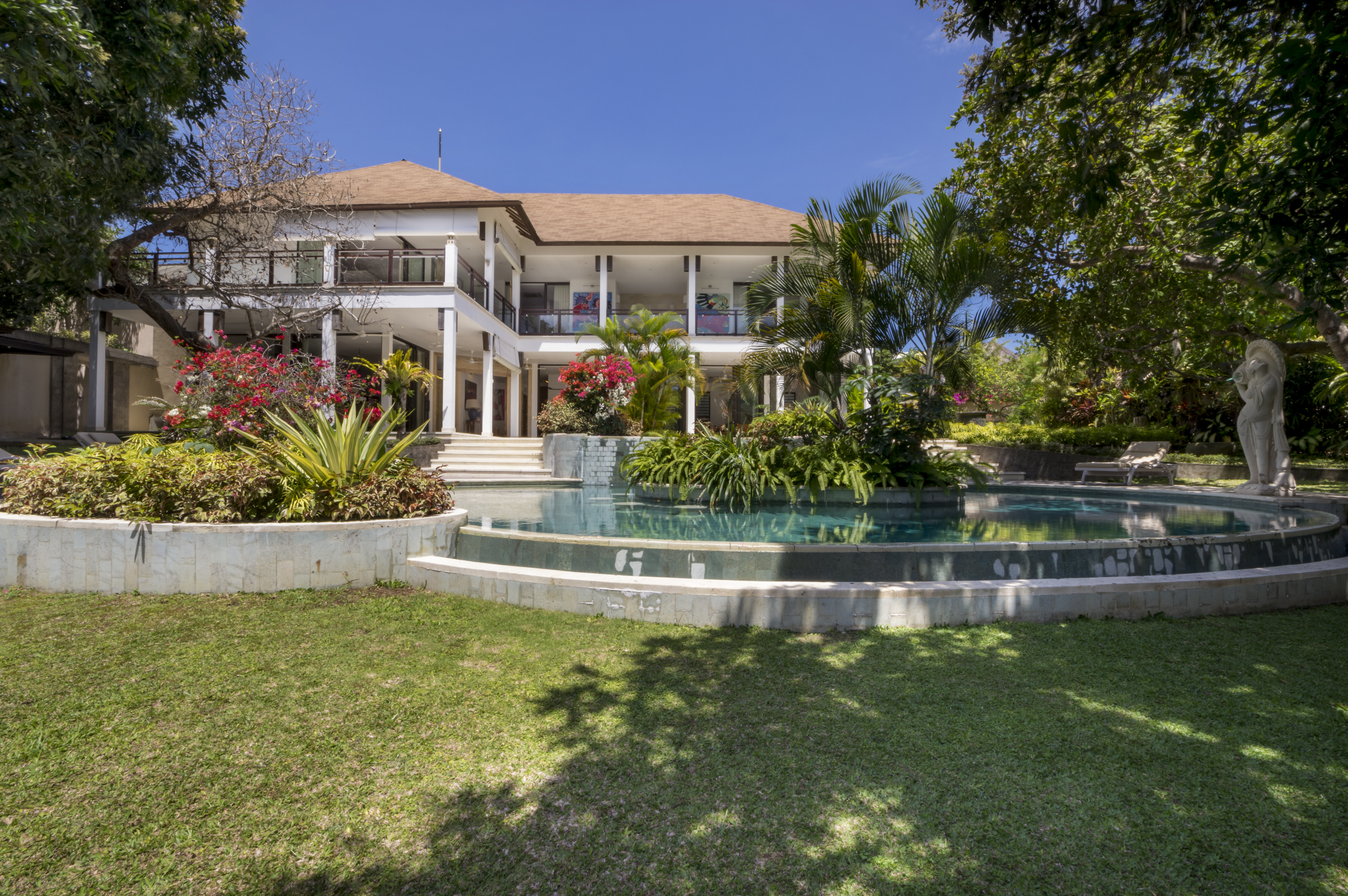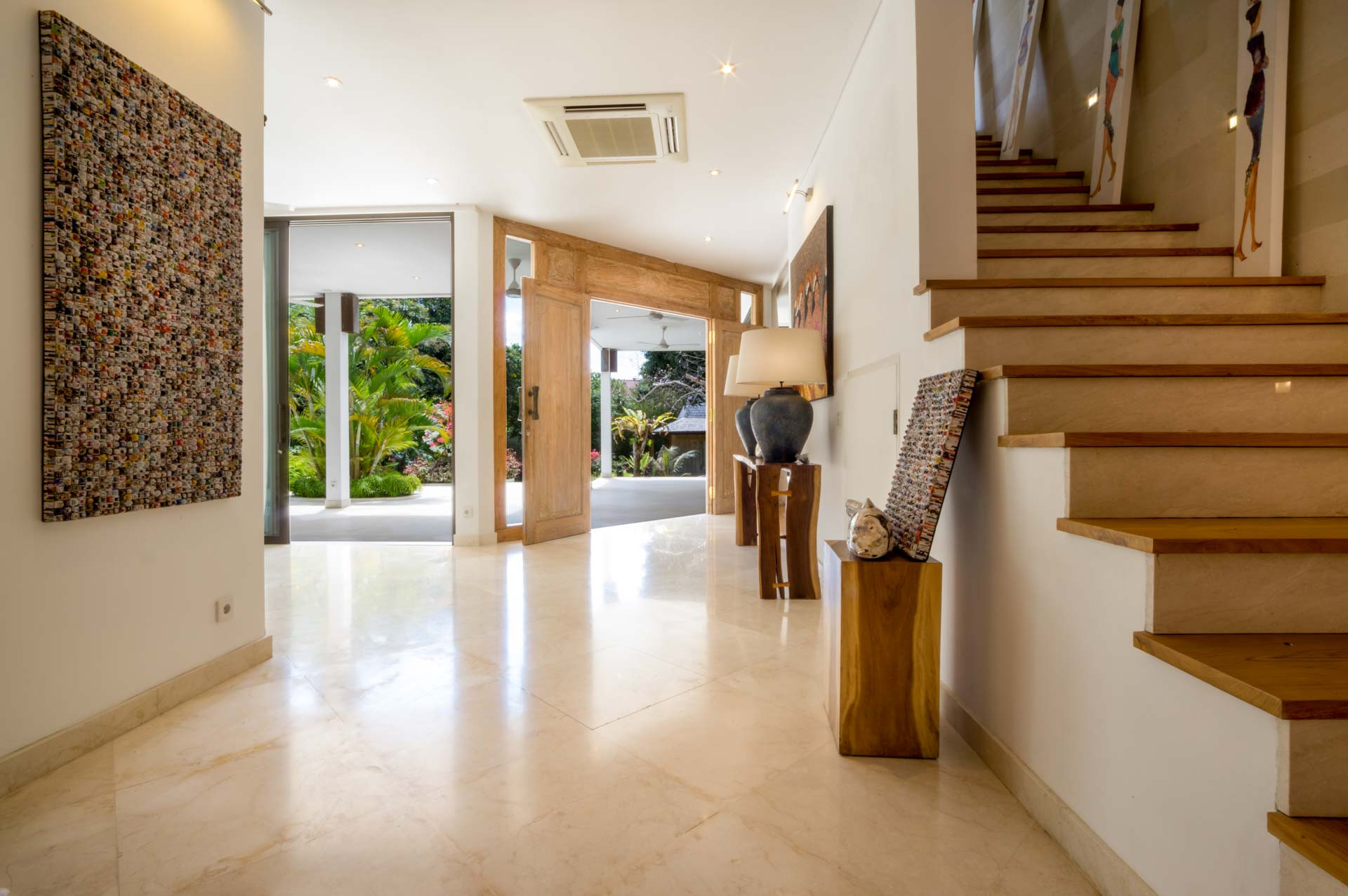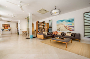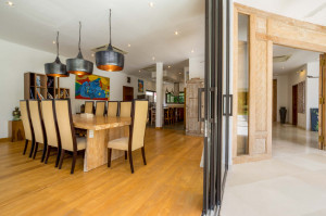 Pintu berukir kayu yang indah akan membawa Anda ke ruang tamu yang luas. Di ruangan ber-AC Anda akan menemukan meja makan kayu tebal yang cukup besar untuk 10 orang untuk makan malam yang lezat bersama atau Anda dapat memilih untuk makan malam di luar di beranda di mana meja makan besar kedua diatur dan ada meja makan besar kedua. Dapur terbuka dengan bar lengkap dengan semua yang Anda butuhkan dan lebih banyak lagi termasuk gudang anggur dan mesin espresso. Bagian lain dari ruang tamu benar-benar terbuka ke taman dan memiliki ruang kantor dengan meja kayu dan kursi desainer dan sudut lounge dengan sofa kulit yang indah dan meja kopi yang serasi. Ada juga televisi layar datar besar dengan sistem suara untuk membuat bioskop di rumah.