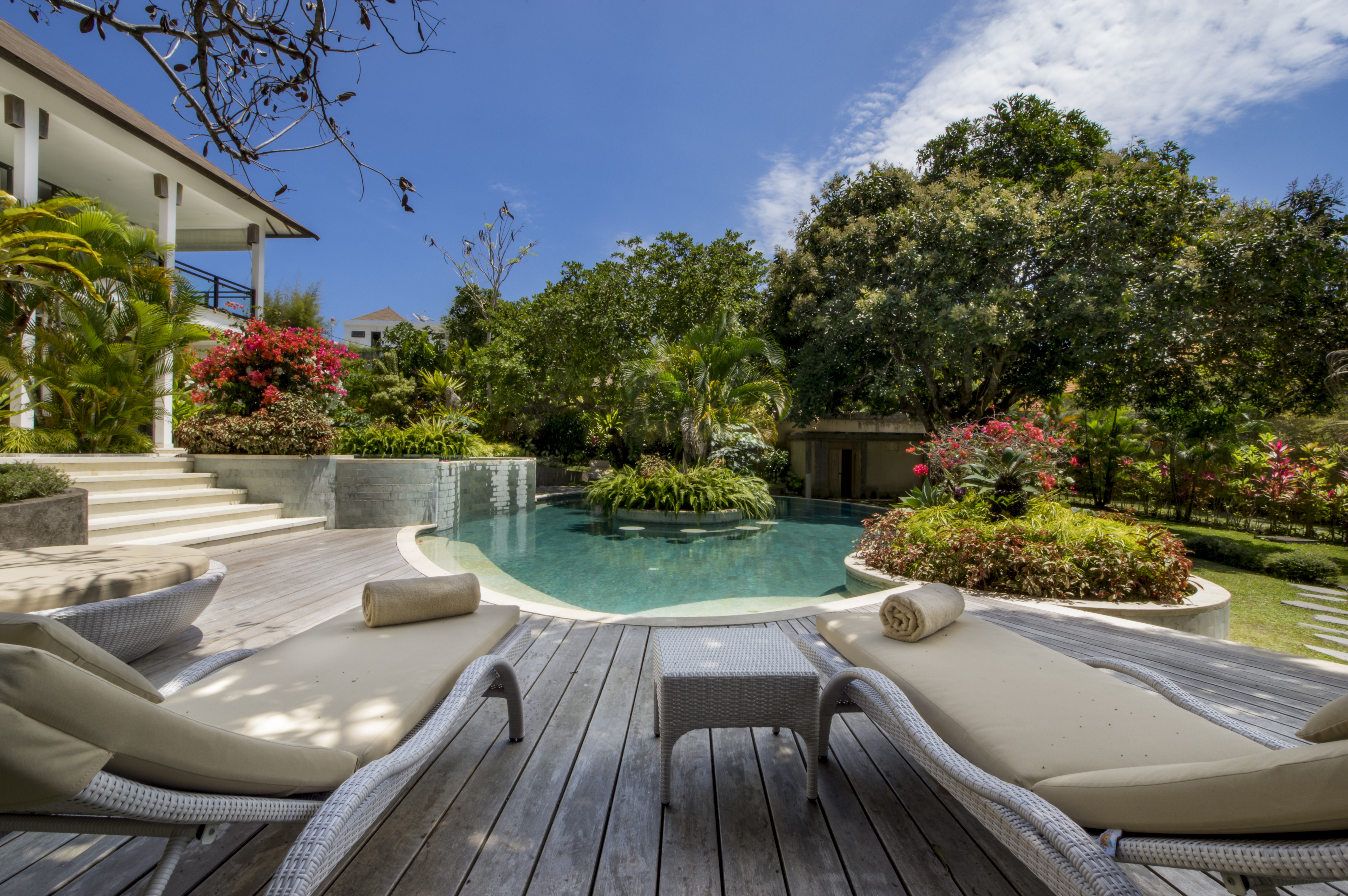 Area luar ruangan yang luas dari Villa Joharuka benar-benar menakjubkan dengan banyak lapisan rumput hijau yang dikelilingi oleh tanaman dan pohon tropis. Ada kolam rendam anak-anak yang penuh dengan kolam renang melengkung. Di tengah kolam terdapat pulau hijau dan ada beberapa kursi yang dibangun di dalam air di mana Anda dapat minum atau bersantai di salah satu kursi berjemur atau sofa daybed. Taman ini juga memiliki pura Bali yang di mana persembahan dilakukan pada bulan purnama atau pada hari-hari suci Bali lainnya; pancuran hujan di luar ruangan; dan ada BBQ besar untuk pesta lezat untuk seluruh keluarga.