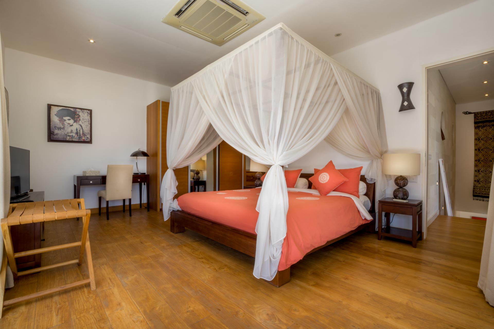 Kamar tidur utama terletak di lantai pertama paviliun utama dan memiliki pintu geser yang membuka ke pemandangan taman yang luar biasa. Kamar ini memiliki tempat tidur kanopi berwarna merah yang indah dengan tirai putih di sekelilingnya, lukisan-lukisan indah dengan interior kayu dan ada televisi layar datar untuk menonton film larut malam. Kamar mandi dalamnya yang cerah dilengkapi dengan bathtub berukir batu dan rainshower yang mewah.